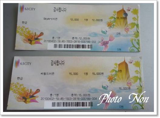 同じ図柄のチケット 展望室12,000ウォン水族館15,000ウォン