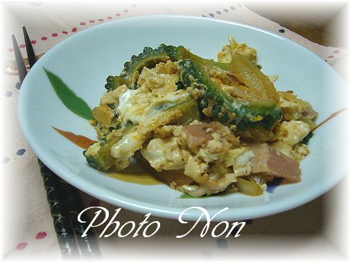 ゴーヤ・豆腐・豚バラ・玉ねぎなどを炒めて卵でとじた