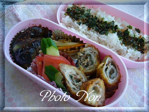 薄切りの豚肉に青シソ・梅干をクルクルっと巻いてフライに