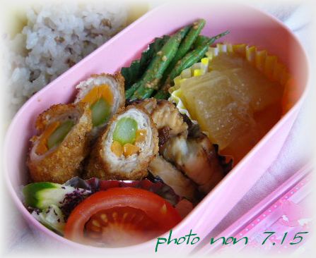 「豚肉のアスパラ巻き」は茹でたアスパラと人参を巻きフライにしたもの。