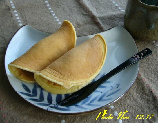 焼いたら、あんこやジャムなどをはさんで二つ折りにする。