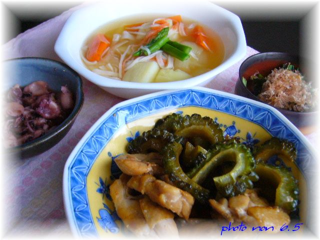 みりんとしょうゆで味付けした「鶏肉とゴーヤの炒め物」