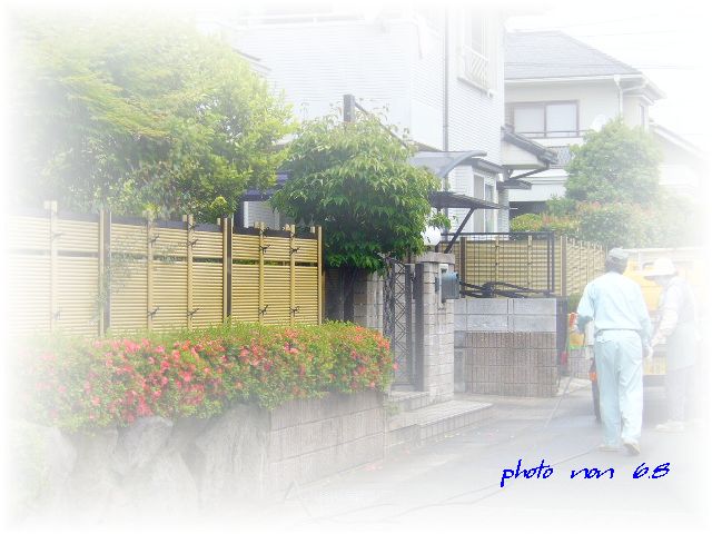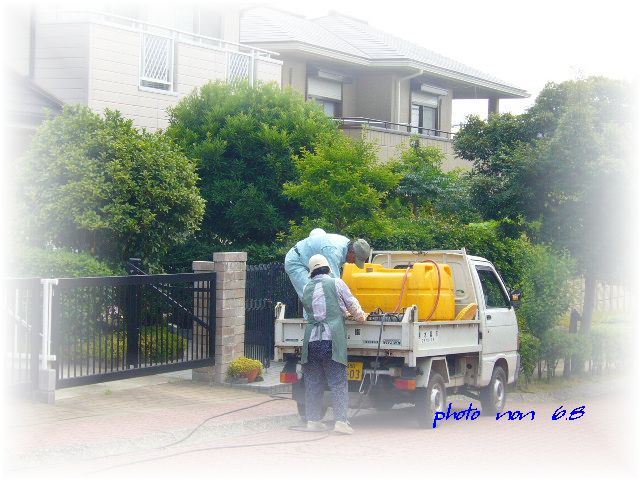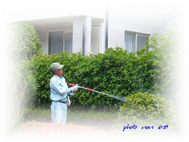 今日は庭木の消毒を「○水園」さんにお願いした。