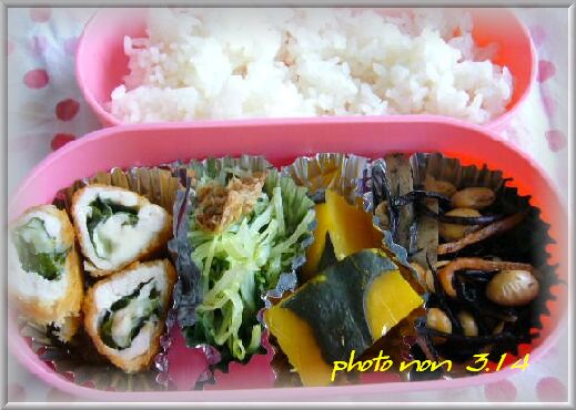「ささ身のチーズフライ」「水菜の煮浸し」「南瓜のたいたん」「ひじき豆」